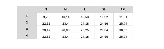 In this table you will find the size specifications of this garment in centimeters.